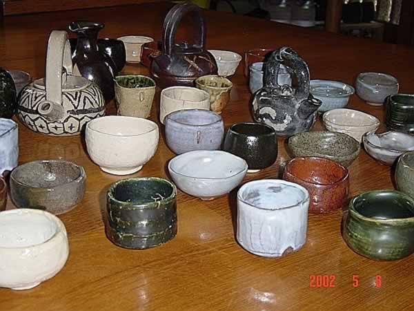 どびんの形ずくりが楽しいので何個も作りました。 象嵌模様もやってみました。 ぐい呑みは白、黒、黄、緑、赤など教室のうわ薬をいろいろ使いました。